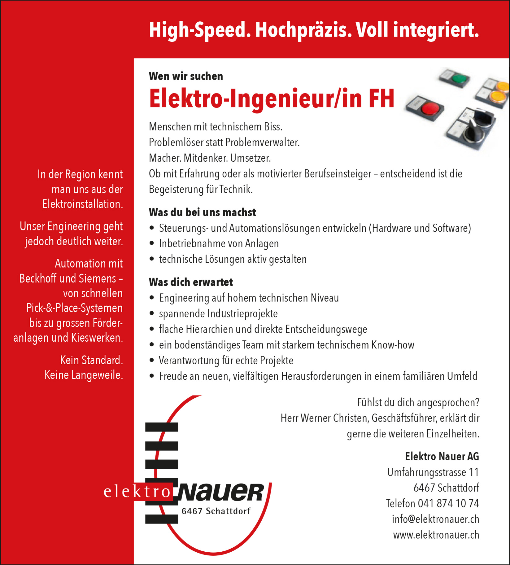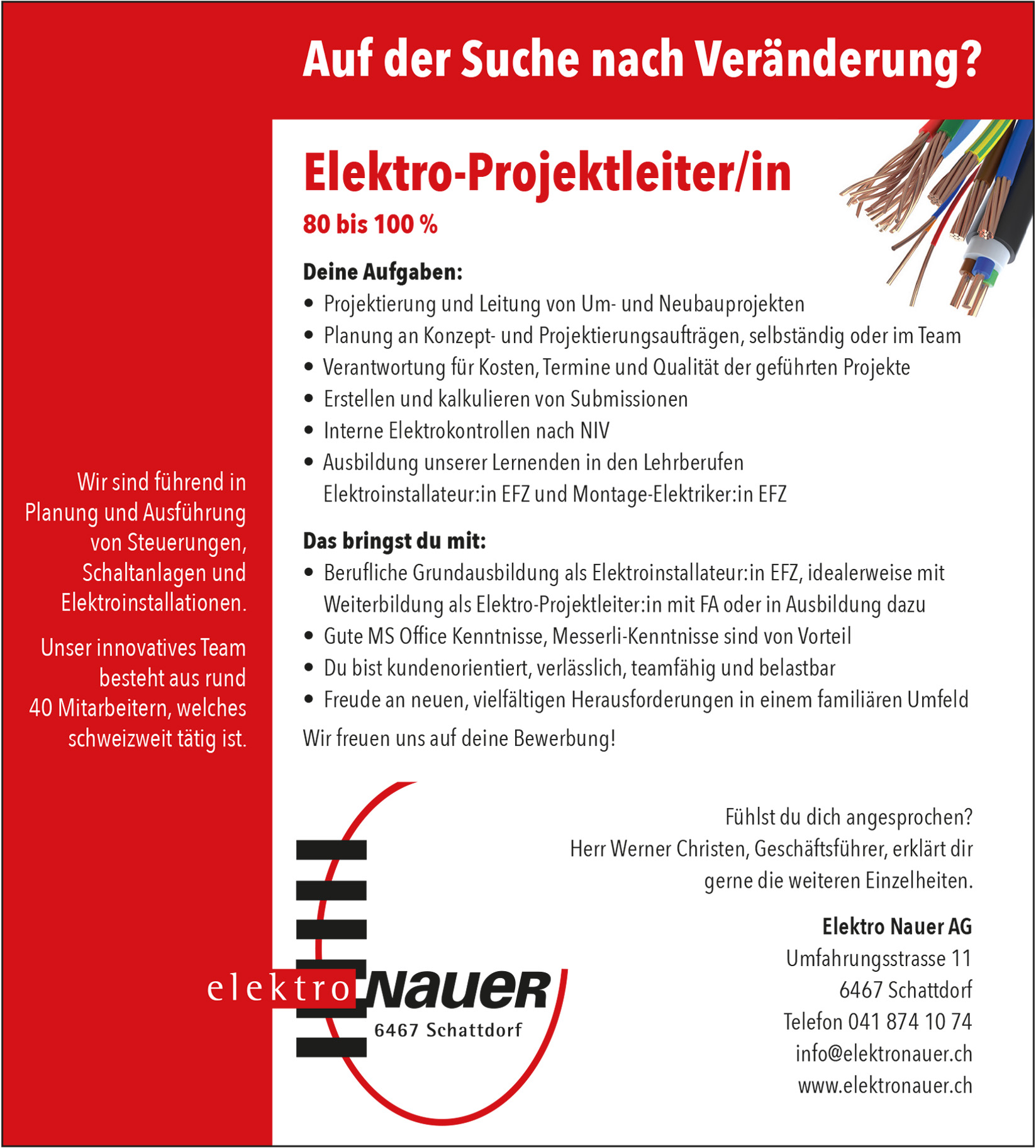 Folgende Lehrstellen bieten wir an und freuen uns, dich bei einerSchnupperlehre kennenzulernen: Elektroinstallateur/in EFZMontageelektriker/in EFZ Bitte schicke deine Bewerbung an:Elektro Nauer AGUmfahrungsstrasse 11Industriegebiet Reuss, Zone JCH-6467 Schattdorf